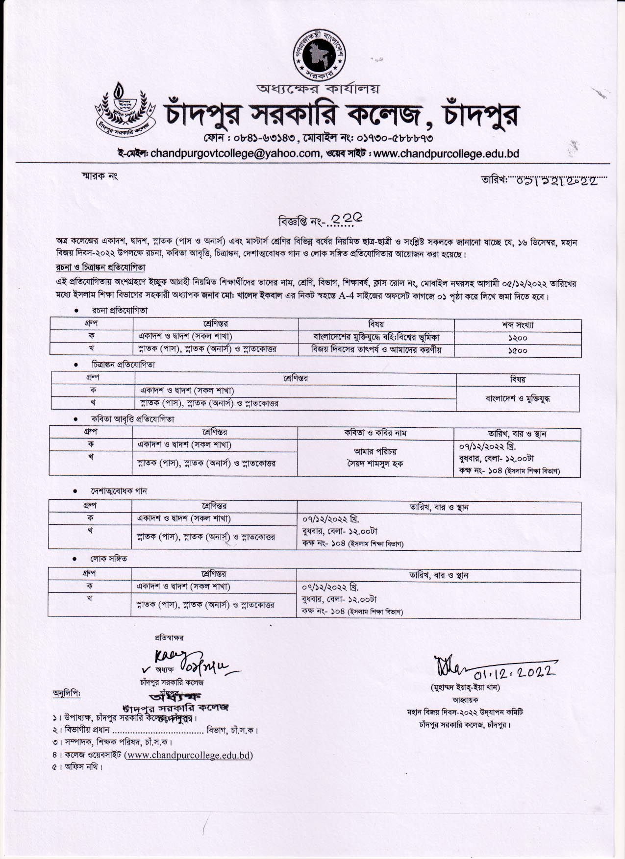 বিজয় দিবস-২০২২ উপলক্ষে রচনা, কবিতা আবৃত্তি, চিত্রাঙ্কন, দেশাত্মবোধক গান ও লোক সঙ্গিত প্রতিযোগিতায় অংশগ্রহণ প্রসঙ্গে। bijoy dibos.jpg322.41 KB Download 56 Version File Count 1 Create Date 1 December, 2022 Last Updated 1 December, 2022 CGC Admin2022-12-01T15:46:38+06:00 Share On Social Media! FacebookXLinkedInWhatsAppPinterestEmail