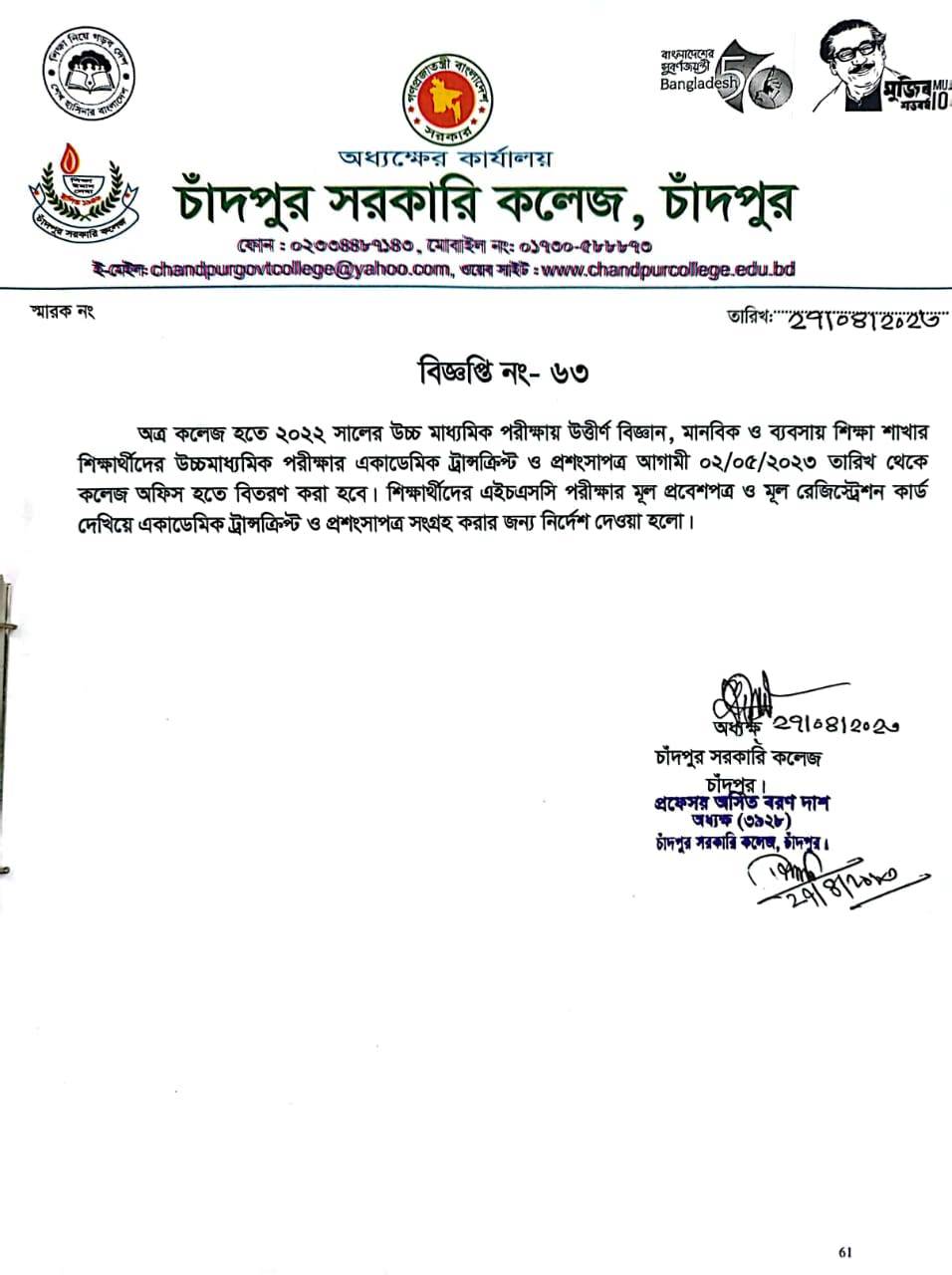 ২০২২ সালের উচ্চ মাধ্যমিক পরীক্ষায় উত্তীর্ণ শিক্ষার্থীদের একাডেমিক ট্রান্সক্রিপ্ট বিতরণের বিজ্ঞপ্তি। notice.jpeg89.45 KB Download 31 Version File Count 1 Create Date 27 April, 2023 Last Updated 27 April, 2023 CGC Admin2023-04-27T14:51:35+06:00 Share On Social Media! FacebookXLinkedInWhatsAppPinterestEmail