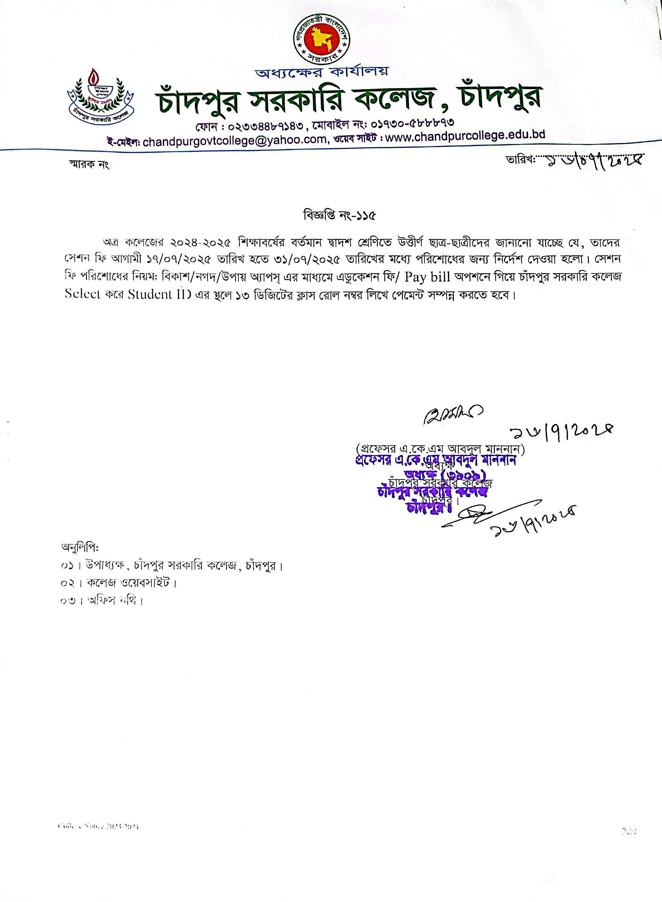 ২০২৪-২০২৫ শিক্ষাবর্ষের বর্তমান দ্বাদশ শ্রেণিতে উত্তীর্ণ শিক্ষার্থীদের সেশন ফি সংক্রান্ত বিজ্ঞপ্তি। session fee notice.jpeg511.13 KB Download 32 Version File Count 1 Create Date 21 July, 2025 Last Updated 21 July, 2025 CGC Admin2025-07-21T09:36:19+06:00 Share On Social Media! FacebookXLinkedInWhatsAppPinterestEmail