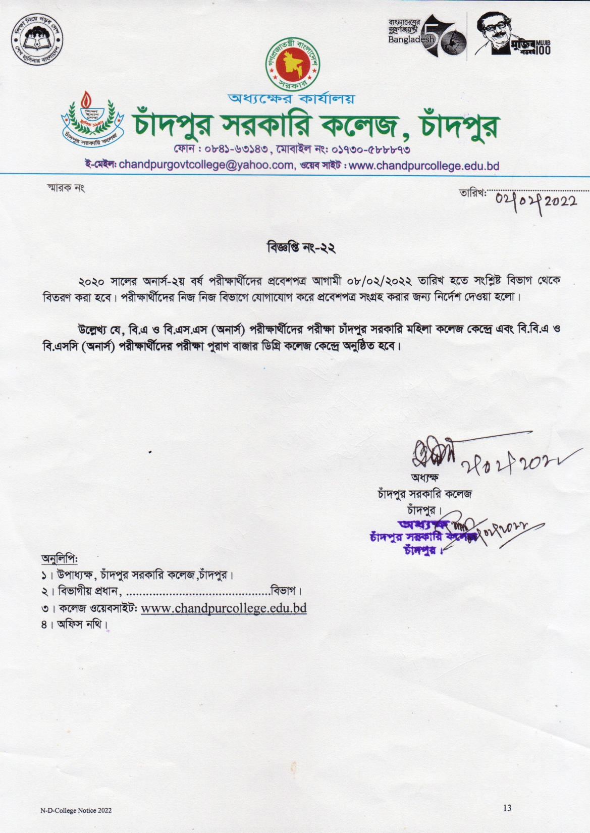 2020 সালের অনার্স 2য় বর্ষ পরীক্ষার্থীদের প্রবেশপত্র বিতরণ সংক্রান্ত বিজ্ঞপ্তি 111111.jpg1.28 MB Download 66 Version File Count 1 Create Date 2 February, 2022 Last Updated 2 February, 2022 CGC Admin2022-02-02T15:06:00+06:00 Share On Social Media! FacebookXLinkedInWhatsAppPinterestEmail