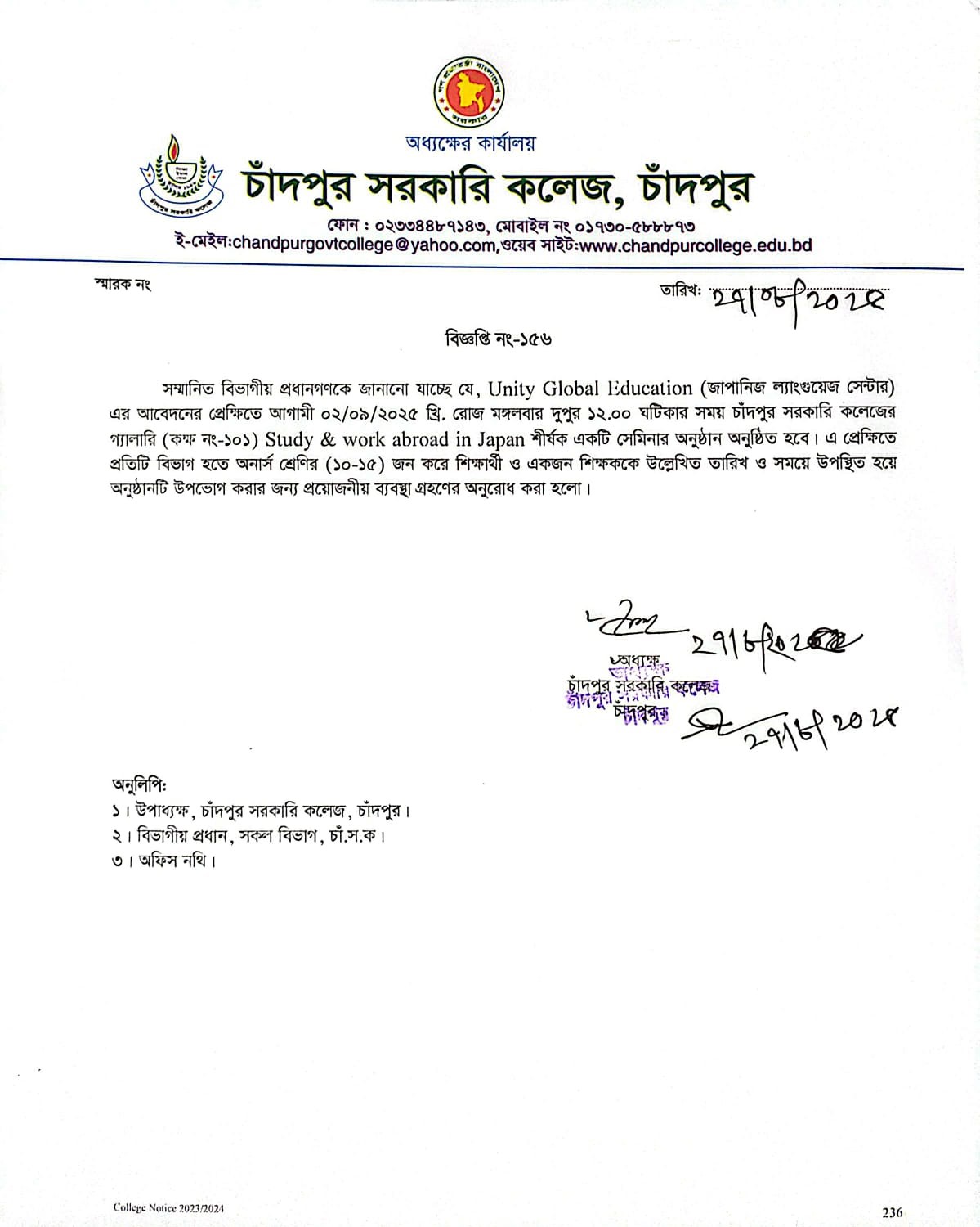 Study & Work Abroad in Japan শীর্ষক একটি সেমিনার অনুষ্ঠান সংক্রান্ত বিজ্ঞপ্তি। notice-156.jpeg172.61 KB Download 28 Version File Count 1 Create Date 27 August, 2025 Last Updated 28 August, 2025 CGC Admin2025-08-28T16:57:48+06:00 Share On Social Media! FacebookXLinkedInWhatsAppPinterestEmail